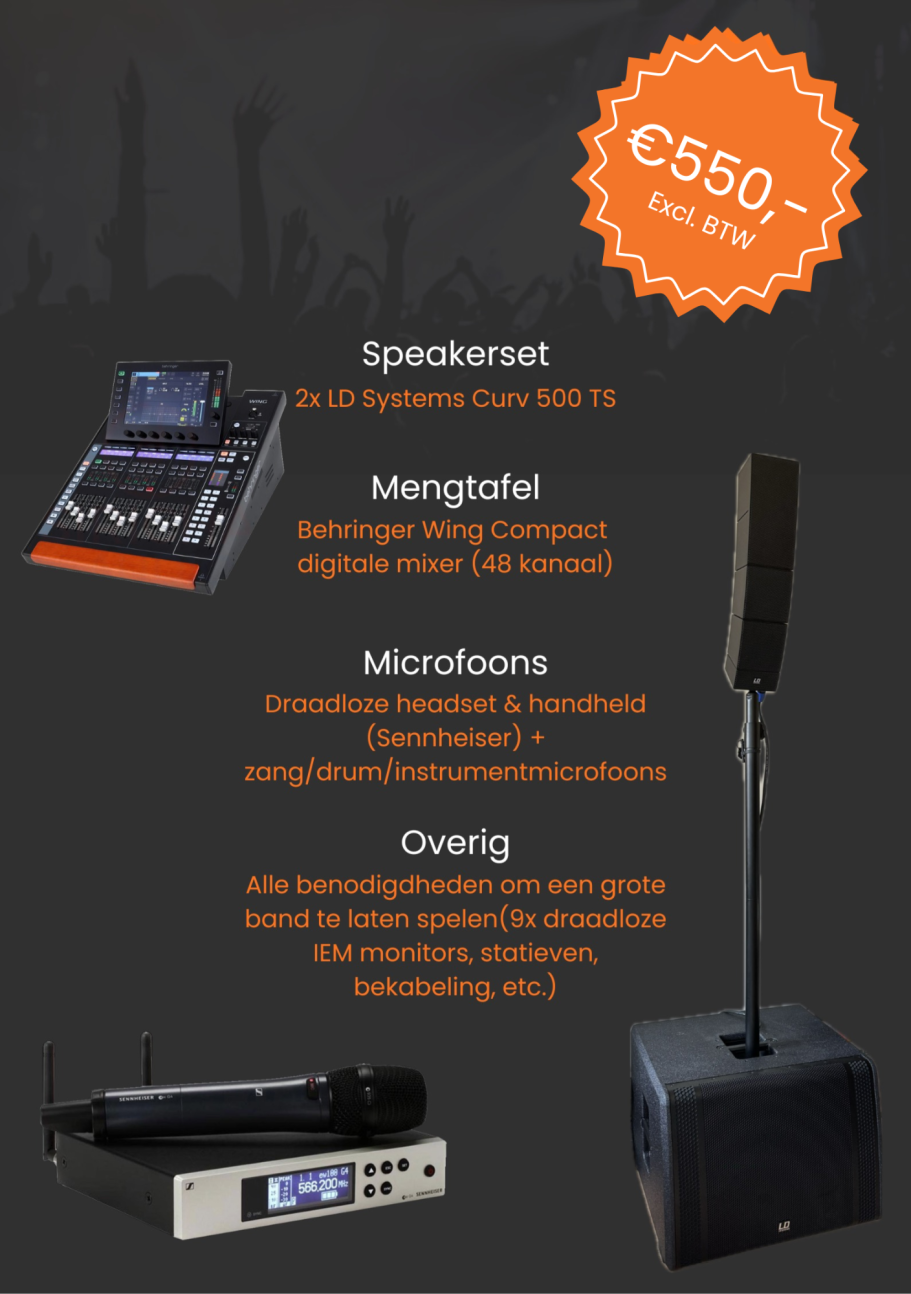 Ik kom zelf altijd mee om de apparatuur te bedienen. Vanaf €550,- (excl. btw) per dag ben je dus verzekerd van een geluidsset met alle benodigdheden plus een geluidsman!